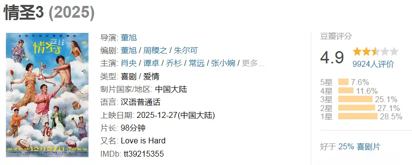 《情圣3》是《情圣》系列第三部作品,当年由肖央主演的《情圣1》备受欢迎,贡献了很多笑点,最终大卖6.5亿票房,可谓相当成功。在《情圣2》由于某些原因不能上映的情况下,这部《情圣3》强势定档2025年12月27号,可谓来势汹汹。